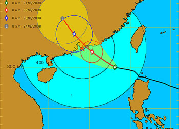 天文臺表示,在正午12時,臺風(fēng)“鸚鵡”集結(jié)在香港的東南偏東約430公里,即在北緯20.3度,東經(jīng)117.7度附近,預(yù)料向西北或西北偏西移動,時速約14公里,大致趨向廣東沿岸。按照現(xiàn)時預(yù)測路徑,“鸚鵡”會繼續(xù)靠近香港。