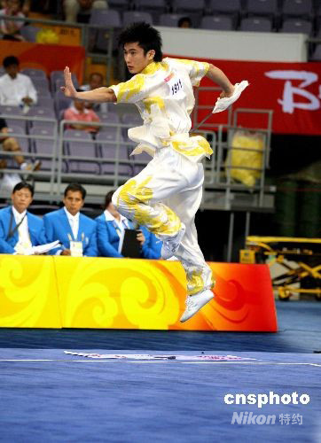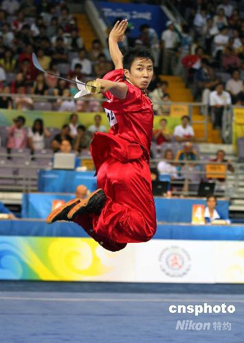 中國澳門參賽隊(duì)員賈瑞在武術(shù)套路男子刀術(shù)賽中奮力拼搏。