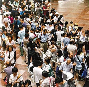 城市計算機(jī)售票網(wǎng)的34個售票點(diǎn),21日上午10時全線發(fā)售大匯演及體育示范表演的門票,每人限購4張大匯演及2張體育示范門票。不少市民聞訊后,擁至各售票處通宵排隊(duì),至21日上午10時正開始發(fā)售,跳水表演門票率先在1.5小時內(nèi)售罄,隨后體操、羽毛球及乒乓球也火速“清貨”。大匯演門票也在短短3小時內(nèi)售罄。不少希望購票市民空手而回。
