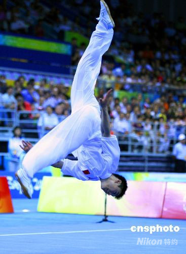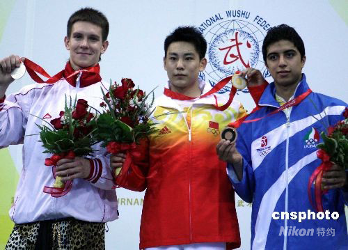 8月22日上午,中國運動員袁曉超在北京2008武術(shù)比賽男子長拳賽中奪得金牌,俄羅斯、伊朗選手分別獲得銀牌和銅牌。中新社發(fā) 宋吉河 攝