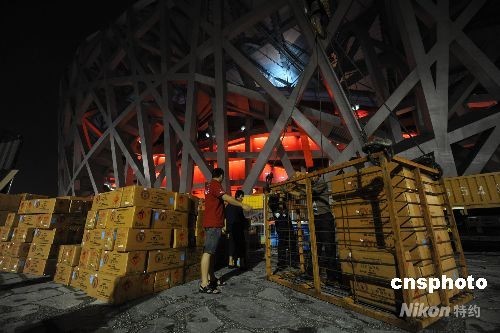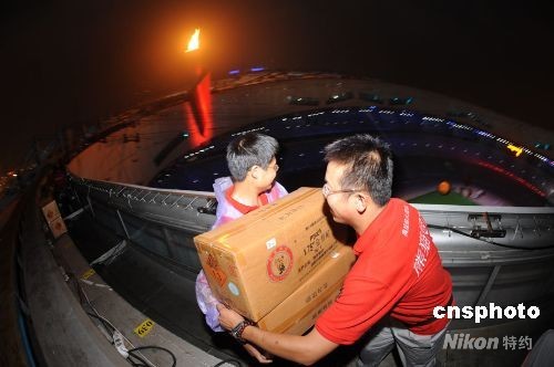 北京奧運(yùn)會(huì)閉幕式上的焰火表演將再次為世人奉獻(xiàn)一場(chǎng)華美的視覺(jué)盛宴。截止到八月二十二日下午,“鳥(niǎo)巢”煙花燃放已準(zhǔn)備就緒,屆時(shí)將為世人展現(xiàn)有別于開(kāi)幕式的令風(fēng)姿。圖為負(fù)責(zé)煙火燃放的人員在鳥(niǎo)巢頂上安裝焰火。中新社發(fā) 鐘新 攝