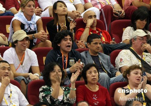 圖:馬拉多納觀戰(zhàn)男籃半決賽 為阿根廷隊加油助威