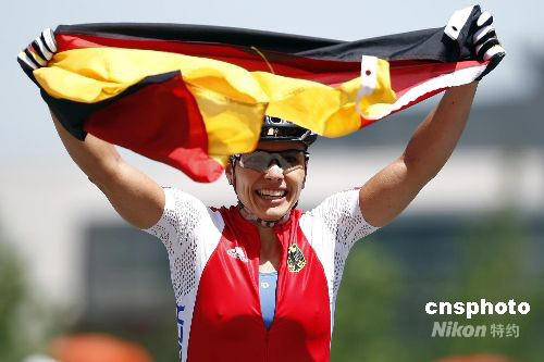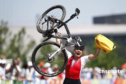 8月23日,北京奧運會自行車山地分項女子越野賽在北京老山山地自行車場舉行。德國選手扎比內(nèi)·施皮茨一路保持領(lǐng)先,最終以1小時45分11秒的成績順利摘金。中新社發(fā) 盛佳鵬 攝