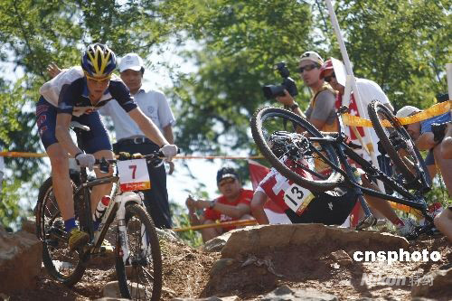 8月23日,北京奧運(yùn)會自行車山地分項(xiàng)女子越野賽在北京老山山地自行車場舉行,不少參賽選手在陡峭的賽道上翻車。中新社發(fā) 盛佳鵬 攝