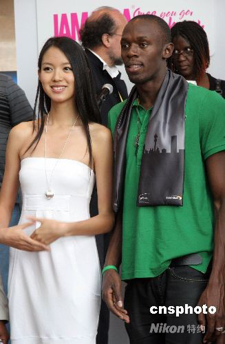 8月23日,世界小姐張梓林向北京奧運(yùn)會(huì)新科“飛人”、牙買加田徑運(yùn)動(dòng)員尤塞恩·博爾特贈(zèng)送一條圍巾,并一起合影留念。當(dāng)天,博爾特在北京向中國(guó)紅十字基金會(huì)捐贈(zèng)善款五萬(wàn)美元,以支持中國(guó)紅十字人道救助事業(yè)。 中新社發(fā) 孫自法 攝