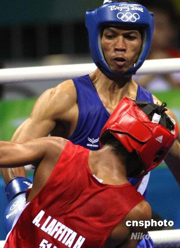 8月23日晚,北京奧運(yùn)會拳擊決賽在北京工人體育館全面打響。在男子輕蠅量級(51公斤級)決賽中,經(jīng)過四個(gè)回合的鏖戰(zhàn),泰國拳擊手頌集·宗觸霍JONGJOHOR Somjit(藍(lán))以8:2戰(zhàn)勝古巴拳擊手安德里斯·拉菲塔·埃爾南德斯,獲得冠軍。 中新社發(fā) 任晨鳴 攝