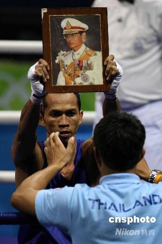 圖為他奪取冠軍后高舉泰國國王像登臺致謝。