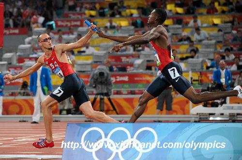 8月23日,美國隊選手杰里米·韋林納(左)從隊友戴維·內維爾手中接棒。當日,美國隊在北京奧運會男子4X400米決賽中以2分55秒39的成績奪得金牌并打破奧運會紀錄。新華社記者 李尕 攝