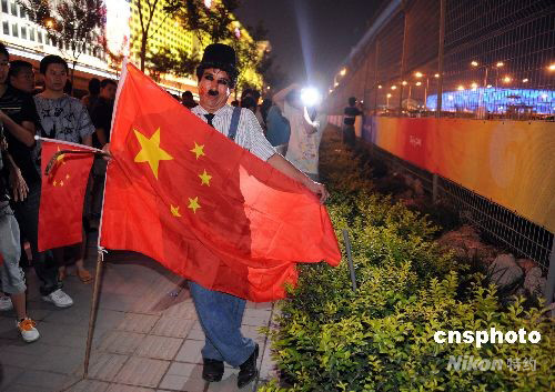北京奧運(yùn)會(huì)進(jìn)入尾聲,奧林匹克公園外人流不減,一位市民扮演喜劇明星“卓別林”。中新社發(fā) 廖攀 攝