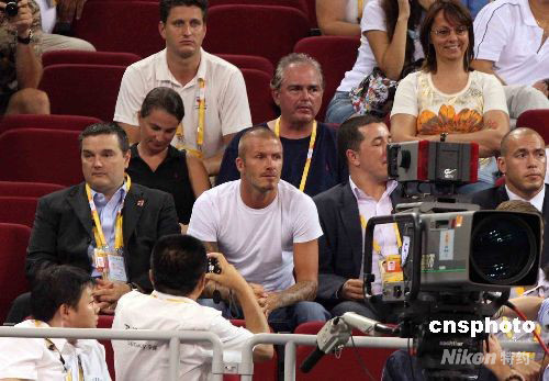 8月24日下午,北京奧運(yùn)會男籃決賽在五棵松籃球館舉行,美國“夢八隊”以118比107艱難戰(zhàn)勝西班牙隊,獲得本屆奧運(yùn)會金牌。圖為前來為北京奧運(yùn)會閉幕式做表演的足球明星貝克漢姆到場觀戰(zhàn)。 中新社發(fā) 任晨鳴 攝