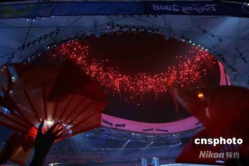 8月24日晚,第二十九屆夏季奧林匹克運(yùn)動會在北京閉幕。盛大閉幕式開始,鳥巢焰火齊放,焰火圖案數(shù)字從29開始倒計(jì)時(shí),最后一個(gè)數(shù)字“0”用拉手花束炸開一個(gè)滾動的、火紅的圓圈,圓圈周長長達(dá)600米,相當(dāng)于圍繞鳥巢碗口“跑”一圈。中新社發(fā) 武仲林 攝