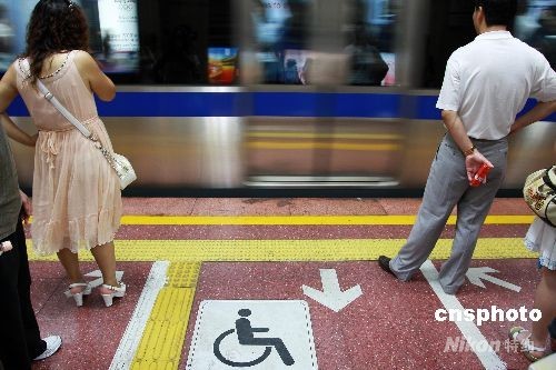 8月27日,一種白色無障礙標(biāo)識開始在北京地鐵1號、2號線各站臺出現(xiàn),使北京地鐵無障礙設(shè)施進一步得到完善,迎接即將到來的殘奧會。圖為北京地鐵2號線阜成門站臺的白色無障礙標(biāo)識。中新社發(fā) 鄭雄增 攝