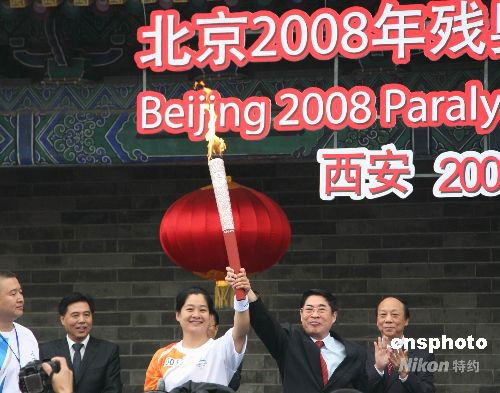 中新網(wǎng)8月29日電 上午9時許,隨著首棒火炬手、全國殘疾人十佳運動員、自學(xué)成才標兵的張輝高擎“祥云”火炬跑出設(shè)在西安市東門城墻城樓的起跑點,北京殘奧會火炬?zhèn)鬟f“中華文明線”首站西安站正式拉開帷幕。