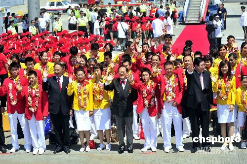 八月二十九日上午十一時,中國國家奧運金牌運動員代表團的六十三名成員乘坐飛機抵達香港機場,特區(qū)行政長官曾蔭權(quán)等官員到場迎接。 中新社發(fā) 譚達明 攝