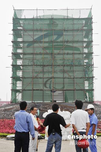 8月29日上午,北京天安門廣場,正在安裝的殘奧會會徽“天地人”。據悉,離殘奧會會徽“天地人”揭幕還剩下最后測量階段。中新社發(fā) 王宇婷 攝
