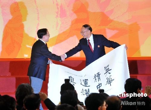 八月二十九日晚,香港特區(qū)政府在會展中心舉行酒會歡迎北京奧運會內(nèi)地金牌運動員代表團訪港。圖為特首曾蔭權(quán)向國家體育總局局長、代表團團長劉鵬致送一幅國學(xué)大師饒宗頤書寫的“奧運精英 光耀中華”字畫。中新社發(fā) 鄧慶樂 攝