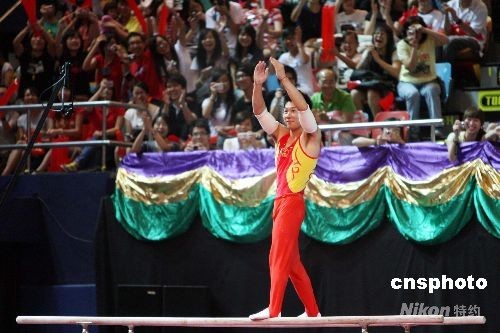 奧運男子雙杠金牌選手李小鵬精彩表演后,站在雙杠上和觀眾招手致意。中新社發(fā) 洪少葵 攝