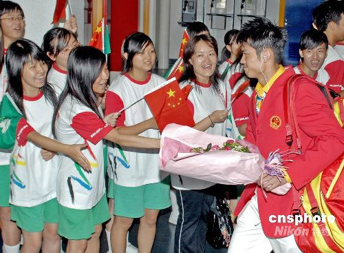 八月三十一日傍晚,北京奧運(yùn)內(nèi)地金牌運(yùn)動員代表團(tuán)一行九十三人抵達(dá)澳門,開始為期三天的訪問。中新社發(fā) 澳門新聞局 攝