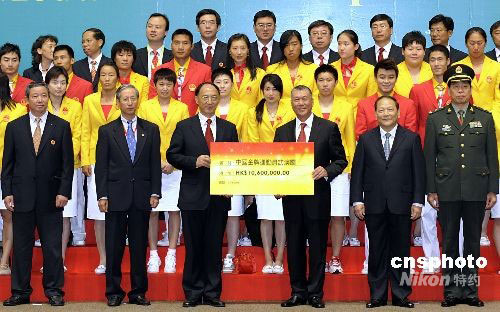 圖為澳門特區(qū)行政長官何厚鏵向代表團(tuán)頒發(fā)獎金。