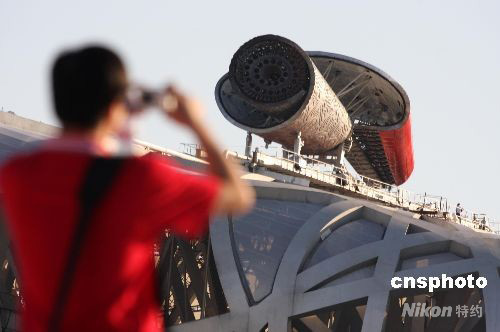 2008年8月31日,工作人員在“鳥巢”上方檢修火炬塔。9月6日,北京殘奧會主火炬將在國家體育場“鳥巢”再一次被點(diǎn)燃。 中新社發(fā) 吳芒子 攝