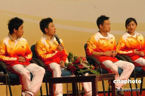 訪問澳門的奧運(yùn)金牌運(yùn)動(dòng)員代表九月一日上午與澳門青少年真情對(duì)話。圖為體操運(yùn)動(dòng)員李小鵬與澳門學(xué)生交流。中新社發(fā) 畢永光 攝