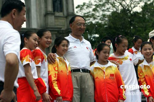九月一日上午,北京奧運(yùn)內(nèi)地金牌運(yùn)動(dòng)員代表團(tuán)在澳門展開(kāi)第二日訪問(wèn)行程,代表團(tuán)團(tuán)長(zhǎng)劉鵬與奧運(yùn)女子體操團(tuán)體金牌選手們?cè)诎拈T著名景點(diǎn)大三巴前留影。中新社發(fā) 洪少葵 攝