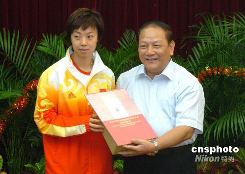 中央駐澳聯(lián)絡(luò)辦九月一日宴請?jiān)L問澳門的奧運(yùn)金牌運(yùn)動員代表團(tuán)。圖為中聯(lián)辦主任白志健向運(yùn)動員代表張怡寧贈送紀(jì)念品。中新社發(fā) 畢永光 攝