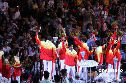 圖為運動員乘坐蓮花車入場,受到熱烈歡迎。中新社發(fā) 洪少葵 攝