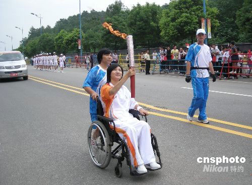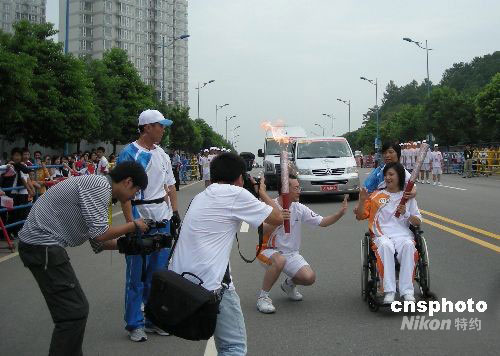 8月31日,高位癱瘓的原湖南衛(wèi)視主持人梁藝擔(dān)當(dāng)?shù)?6棒火炬手在長沙市進行北京殘奧會火炬手傳遞。8月30日,榮獲第九屆全球熱愛生命獎?wù)碌膴涞准琅核噺谋本┶s到長沙市華雅華天大酒店進行北京殘奧會火炬手的培訓(xùn)。31日,她擔(dān)任長沙市第16棒火炬手,進行北京殘奧會火炬?zhèn)鬟f,為北京殘奧會加油。新聞背景:梁藝原名梁瓊,1979年她出生于湖南省婁底市(下轄的漣源市)一個小學(xué)教師家庭,2001年7月,22歲的梁藝畢業(yè)于北京廣播學(xué)院播音主持藝術(shù)學(xué)院。同年加盟湖南電視臺都市頻道,主持該臺的開播晚會,并任大型現(xiàn)場娛樂節(jié)目《都市有情人》和音樂節(jié)目《都市新聲代》節(jié)目主持人。中新社發(fā) 郭國權(quán) 攝