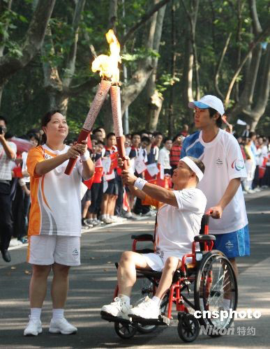 九月二日上午,北京殘奧會圣火來到古都南京,受到民眾的熱烈歡迎,圖為火炬手進(jìn)行火炬?zhèn)鬟f。中新社發(fā) 牛莉 攝
