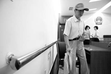 圖為奧運(yùn)村無障礙法庭內(nèi)安裝了便于殘障人員扶持的金屬桿。庭審結(jié)束,祁寶麟起身準(zhǔn)備離開法庭 李松 黃潔 徐偉倫攝
