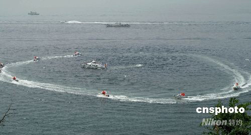 圖為殘奧火炬?zhèn)鬟f經(jīng)過(guò)大連濱海路時(shí),海上表演項(xiàng)目為傳遞活動(dòng)增色。 中新社發(fā) 宋太盛 攝