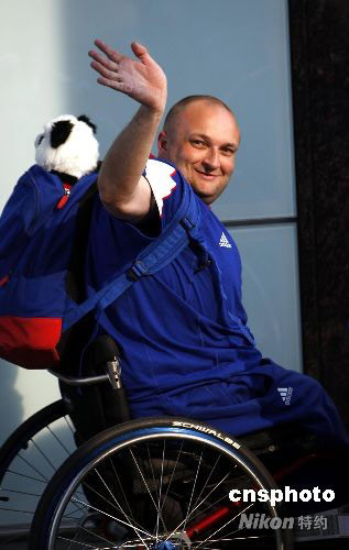 圖為英國殘奧會運(yùn)動員身背熊貓玩偶抵達(dá)北京首都國際機(jī)場。