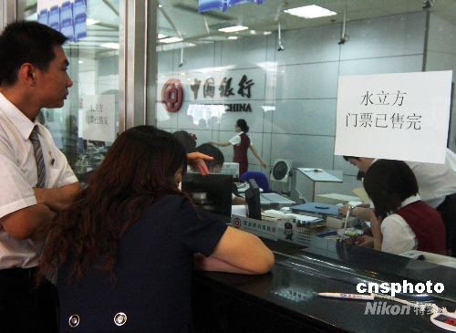 9月3日,觀眾在中國(guó)銀行北京王府井支行銷售網(wǎng)點(diǎn)排隊(duì)購買殘奧會(huì)門票。據(jù)悉,從2日開始,又有一定數(shù)量的殘奧會(huì)比賽門票向公眾投放!八⒎健焙汀傍B巢”的殘奧會(huì)門票依然最火爆。但因?yàn)橥斗艛?shù)量不同,“水立方”門票只十分鐘就全部售光,中行王府井支行柜臺(tái)已經(jīng)張貼“水立方售完”告示。中新社發(fā) 吳芒子 攝