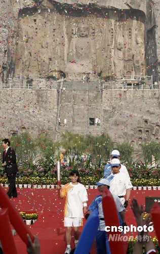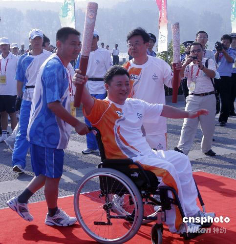 9月4日,火炬手在最具洛陽特色的城市名片--世界文化遺產龍門石窟景區(qū)內傳遞殘奧會火炬。當日,北京2008殘奧會火炬在千年帝都、牡丹花城洛陽傳遞,有65名火炬手參加傳遞。北京2008殘奧會火炬?zhèn)鬟f共有兩條線路,一是“時代風采線”,二是“中華文明線”,洛陽是“中華文明線”5個殘奧會火炬?zhèn)鬟f城市之一,也是進入北京前的最后一個傳遞城市。9月5日兩路火炬將在北京匯合,9月6日晚在殘奧會開幕式主會場點燃主火炬。中新社發(fā) 張曉理 攝