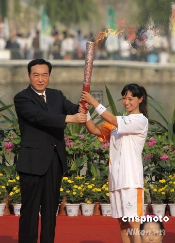 中共河南省委副書記陳全國(左),將第一棒殘奧會火炬交予殘疾運動員朱宏艷手中,火炬開始在河南洛陽傳遞。