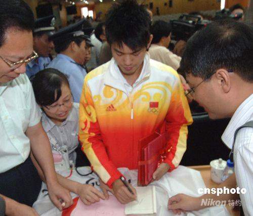 圖為奧運會羽毛球男單冠軍林丹為家鄉(xiāng)球迷簽名。 中新社發(fā) 劉可耕 攝