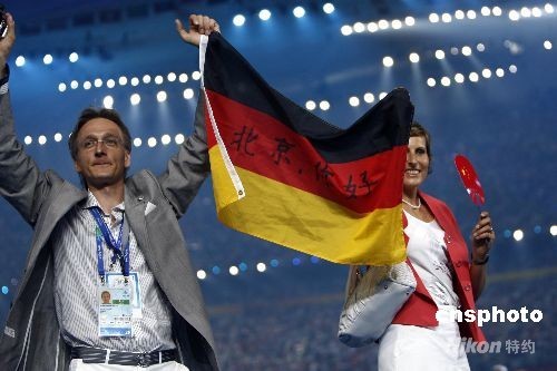 9月6日晚,北京2008殘奧會(huì)開(kāi)幕式在國(guó)家體育場(chǎng)“鳥(niǎo)巢”舉行。圖為德國(guó)選手入場(chǎng)時(shí)展示在國(guó)旗上用中文書(shū)寫的“北京,你好”。中新社發(fā) 杜洋 攝