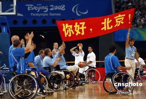 9月7日,北京殘奧會(huì)輪椅籃球比賽中,瑞典隊(duì)在比賽結(jié)束時(shí)打出了“你好,北京!”的標(biāo)語(yǔ)。中新社發(fā) 杜洋 攝