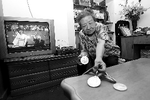 昨日,賈大媽在家展示王義在硬地滾球比賽中獲得的獎牌。本報記者 韓萌 攝