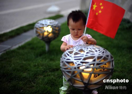 9月8日,北京正在舉辦殘奧會(huì)的國家體育場外,一位可愛的小朋友往“鳥巢路燈”上插國旗。中新社發(fā) 廖攀 攝