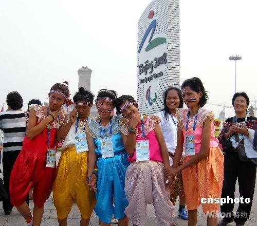 2008年9月8日,為北京殘奧會助威的泰國“啦啦隊”成員來到天安門廣場游覽,并高興地拍照留影。中新社發(fā) 玉龍 攝