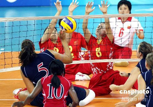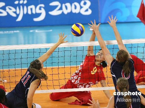 北京殘奧會(huì)坐式排球9月9日晚繼續(xù)在北京的中國(guó)農(nóng)業(yè)大學(xué)體育館舉行,雅典殘奧會(huì)冠軍中國(guó)女隊(duì)以3比0完勝美國(guó)隊(duì)。中新社發(fā) 任晨鳴 攝