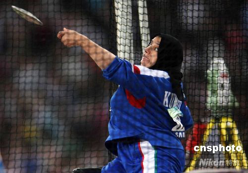 9月10日晚,北京殘奧會田徑各項比賽繼續(xù)在北京奧林匹克公園內(nèi)的國家體育場-鳥巢舉行,各國女子大力士在鐵餅比賽中竭盡全力向冠軍發(fā)起沖擊。圖為頭戴黑色頭巾的科威特選手瑪哈·謝拉揚(yáng)奮力將鐵餅擲出。 中新社發(fā) 任晨鳴 攝