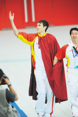 雖然最終收獲的還是“銀鑲玉”,但是楊博尊的心情已和8日晚有著天壤之別,臉上掛滿了笑容。“這雖然不是我的主項,但是我發(fā)揮得很好,超越了自己,F(xiàn)在我終于知道,‘水立方’不僅有‘金鑲玉’,還有更多的是超越。無論是我,還是我的隊友,我們都很努力,都在不斷地超越自己!迸d奮的楊博尊披上了早就準(zhǔn)備好的“戰(zhàn)袍”,這本是他為自己奪冠時準(zhǔn)備的。