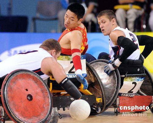 9月12日,殘奧會(huì)輪椅橄欖球比賽在北京科技大學(xué)體育館開賽,揭幕戰(zhàn)中國隊(duì)以30-65不敵世界排名第一的美國隊(duì)。剛剛組建一年的中國隊(duì)雖然戰(zhàn)敗,但始終面對微笑頑強(qiáng)拼搏永不言棄的球員們卻贏得了滿堂喝彩,贏得了包括美國隊(duì)在內(nèi)的各方交口稱贊。中新社發(fā) CNAsports_p 攝