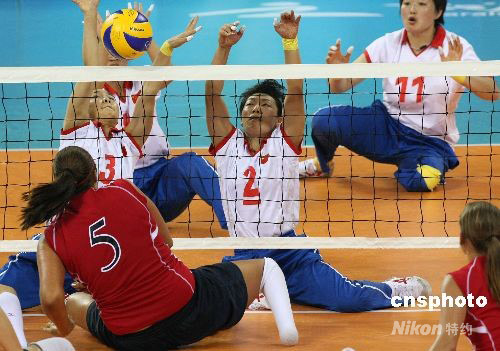 9月14日晚,北京殘奧會(huì)坐式女排決賽在北京的中國農(nóng)業(yè)大學(xué)體育館舉行,雅典殘奧會(huì)冠軍中國隊(duì)以3:0戰(zhàn)勝美國隊(duì)蟬聯(lián)冠軍。 中新社發(fā) 任晨鳴 攝