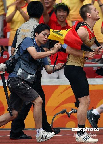 北京殘奧會(huì)田徑比賽9月16日繼續(xù)在北京奧林匹克公園內(nèi)的國(guó)家體育場(chǎng)--鳥巢舉行,F(xiàn)42級(jí)別的德國(guó)選手沃伊特克·奇日在男子跳遠(yuǎn)-F42/44級(jí)別決賽中以6.50米、1101分的成績(jī)打破世界紀(jì)錄獲得冠軍。賽后,沃伊特克·奇日身披國(guó)旗繞場(chǎng)飛奔與攝影記者“賽跑”。中新社發(fā) 任晨鳴 攝