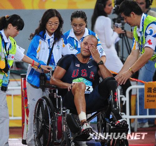 9月9日,在國家體育場進(jìn)行的北京2008年殘奧會男子100米T44級決賽中,有實(shí)力爭奪獎牌的美國選手馬龍·雪利在比賽途中摔倒。這位美國選手最終眼含遺憾的淚水離開了賽場。新華社記者 李尕 攝