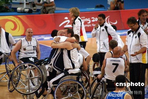 2008年9月11日下午,北京殘奧會男子輪椅籃球瑞典對德國的比賽在國家體育館打響,德國最終以微弱優(yōu)勢艱難戰(zhàn)勝對手。獲勝后,德國隊全體隊員熱烈擁抱歡慶勝利。 中新社發(fā) 馬小剛 攝